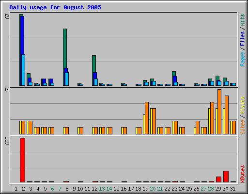 | Day | Hits | Files | Pages | Visits | Sites | KBytes | ||||||